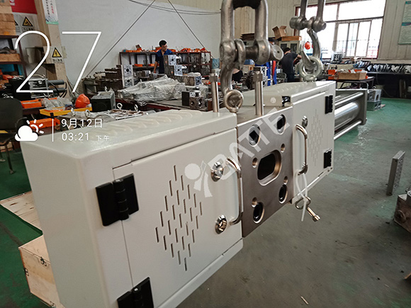 擠出機(jī)換網(wǎng)器為雙工作位替換工作,一慮網(wǎng)過(guò)濾,一慮網(wǎng)在換網(wǎng)器主體外備用。往復(fù)板板兩端有網(wǎng)塊保溫加熱裝置,用于過(guò)濾易結(jié)晶或易老化的塑料時(shí),在更換濾網(wǎng)時(shí)應(yīng)取出網(wǎng)塊,清除出網(wǎng)孔中的塑料。單板式換網(wǎng)器在更換慮網(wǎng)時(shí)有蓄能器增加動(dòng)力,因此更換濾網(wǎng)網(wǎng)的速度快、動(dòng)力大,在更換慮網(wǎng)時(shí)嚴(yán)禁網(wǎng)塊或?yàn)V網(wǎng)毛邊漏出往復(fù)板外面,更不允許用手觸摸。
